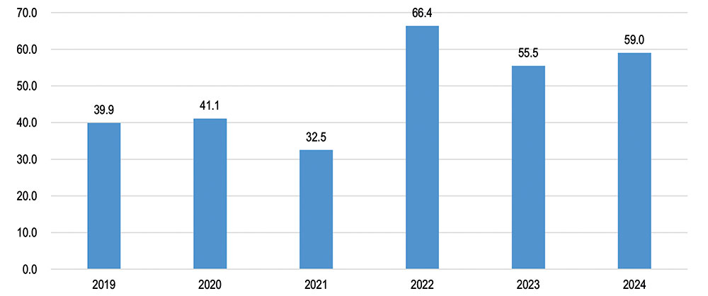 Stati Uniti. Import di mobili per ufficio dall’Italia, 2019-2024. Milioni di dollari – Fonte CSIL su dati da fonte ufficiale