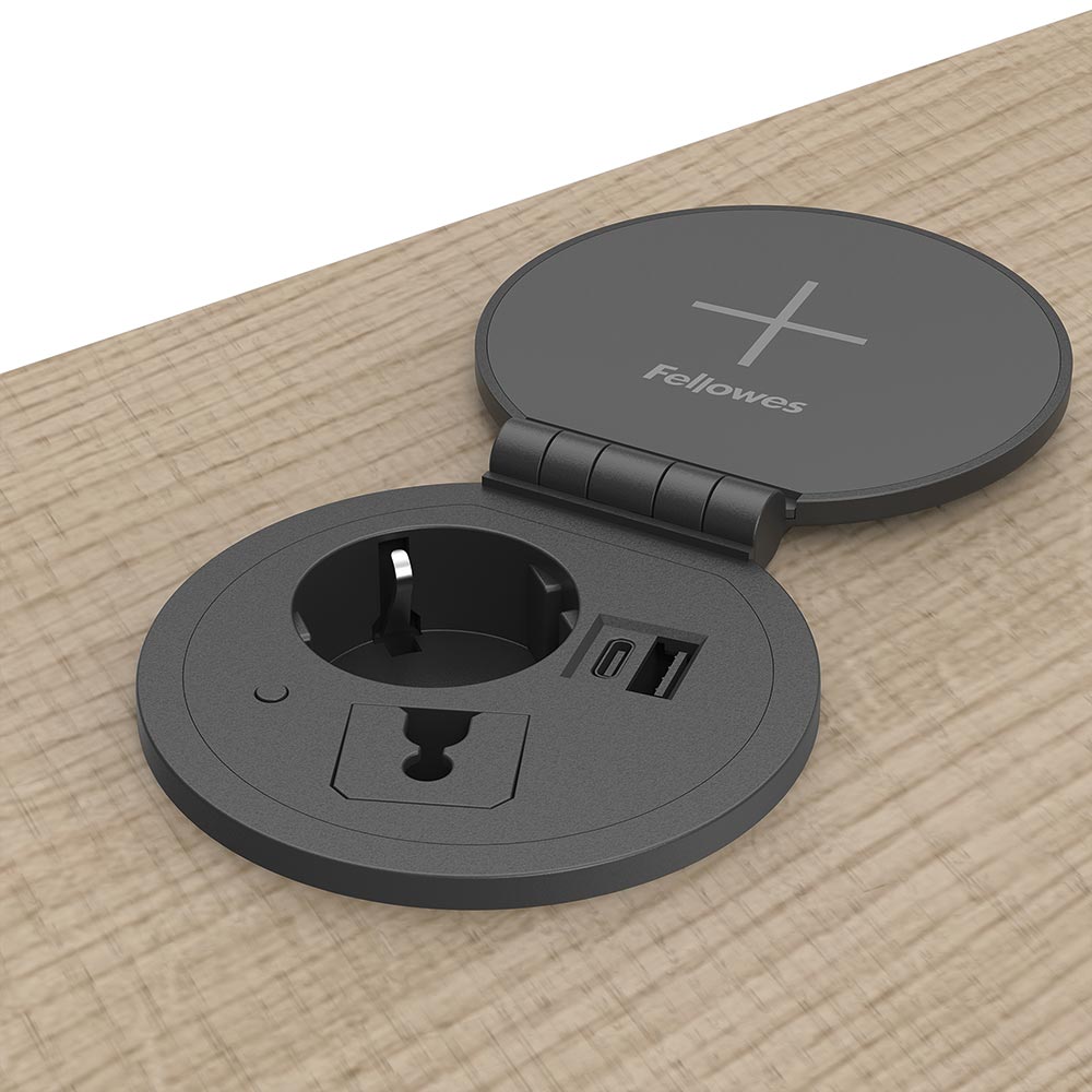 Mentre per contesti come sale meeting, huddle room o postazioni flessibili, Fellowes ha sviluppato le soluzioni Pop-Up a scomparsa, o Power Spot progettate per integrarsi nel piano del tavolo e attivarsi solo in caso di necessità. L’integrazione a filo consente di mantenere la continuità delle superfici, preservando la pulizia formale del layout, con il vantaggio di una connessione sempre disponibile ma discreta, inoltre le unità di elettrificazione sono integrabili con degli specifici Keystone secondo le logiche di adattabilità ai vari ambienti di lavoro.
