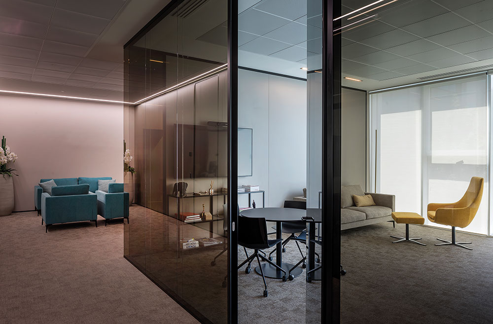 Per gli uffici direzionali di Tecnoferrari a Fiorano Modenese è stata scenta la parete vetrata a doppio vetro finitura fumé Planilux Plus in abbinamento alle scrivanie Flat e ai tavoli tondi Oasis. Completano gli spazi direzionali divani e poltroncine per creare angoli attesa o relax, che richiamano l’ambiente domestico. Prodotti di Level. Foto Andrea Pancino