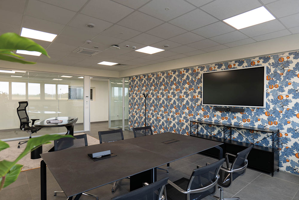 Realizzato da Mondoffice, questo ambiente direzionale è stato arredato con la scrivania scultorea 0 disegnata da Karim Rashid per Della Rovere affiancata da poltrone e sedute ICF e da un sistema integrato THEC con monitor interattivo e room booking system. A parete la carta da parati Frutto Proibito di Fornasetti