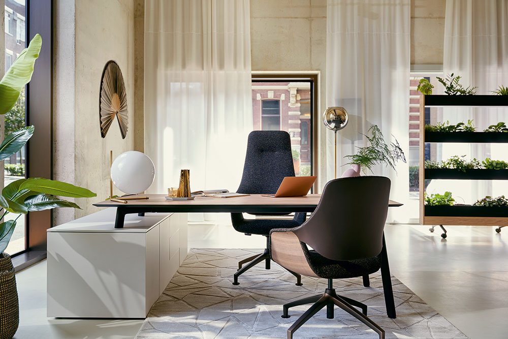 Una postazione di lavoro manageriale deve essere funzionale e al contempo riflettere lo status. La scrivania se:vision di Sedus grazie a un’ampia scelta di materiali e colori, può essere adattata agli stili individuali, da quello più purista a quello più accogliente. Integrabile con l’elemento di archiviazione se:vision storage. In abbinamento la seduta se:mission con braccioli integrati contribuisce a creare un’atmosfera di lavoro accogliente e moderna