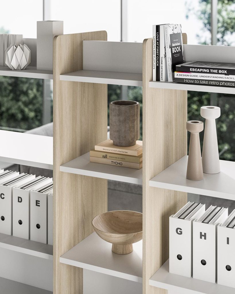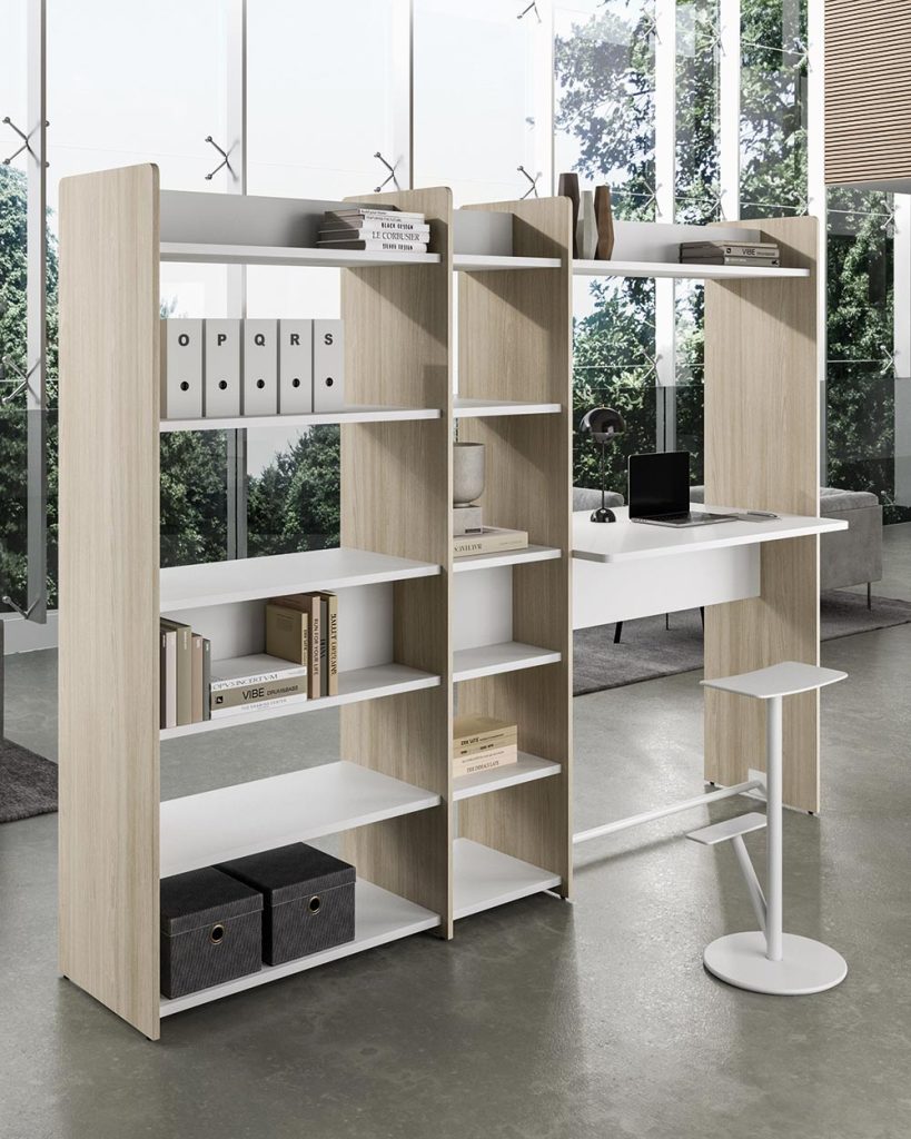 Si tratta di librerie bifacciali che non ostacolano la visibilità, ma offrono soluzioni intelligenti per la divisione degli spazi, allo scopo di dar vita ad ambienti luminosi e ben progettati. Le librerie multifunzionali non solo separano gli ambienti in modo elegante e moderno, ma aggiungono anche pratiche postazioni di lavoro che possono essere utilizzate da ospiti e visitatori.