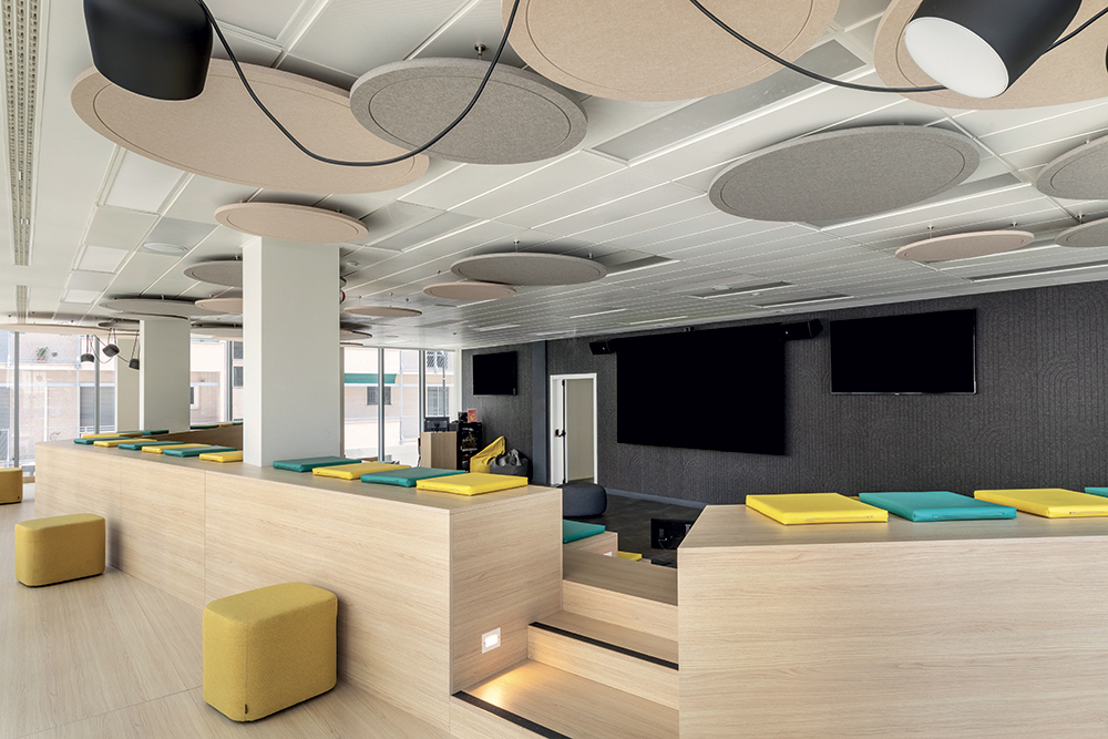 Attorno all’anfiteatro si articolano la Food City (54 posti) – concepita come luogo di socialità e pausa, cuore conviviale della sede – e le zone silenziose, dedicate alla concentrazione di gruppo e individuale.