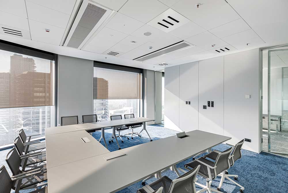 Per gli uffici la ricerca si è concentrata su soluzioni in grado di coniugare estetica formale, integrazione impiantistica e prestazioni acustiche di alto livello. Requisiti che sono stati soddisfatti con un sistema modulare per i controsoffitti sviluppato ad hoc: Ecophon Focus™ Dp. Nato dalla combinazione dei sistemi Focus™ Dg e Focus™ Lp, il sistema presenta uno scuretto di 8 mm nella direzione longitudinale, che scandisce con eleganza il ritmo del soffitto, mentre sul lato trasversale adotta un bordo nascosto assicurando così un aspetto continuo e minimale. La modularità e stabilità del pannello facilita l’integrazione dei corpi illuminanti, delle bocchette di ventilazione e dei sensori, garantendo ispezionabilità e una perfetta coerenza estetico-funzionale con gli elementi impiantistici. Come tutti i sistemi della gamma Ecophon Focus™, anche Focus™ Dp offre elevate performance estetiche e acustiche (Classe di assorbimento A) assicurando controllo del riverbero e chiarezza del parlato anche in ambienti complessi come open space, corridoi, hall e aree direzionali.
